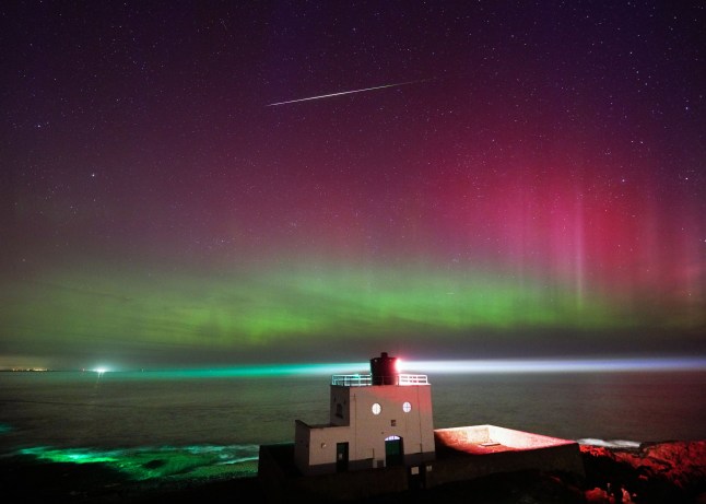 A meteor appears as the aurora borealis,commonly known as the Northern Lights,light up the skies above Bamburgh lighthouse in Northumberland during a G3 solar storm last night (Picture: Owen Humphreys/PA)