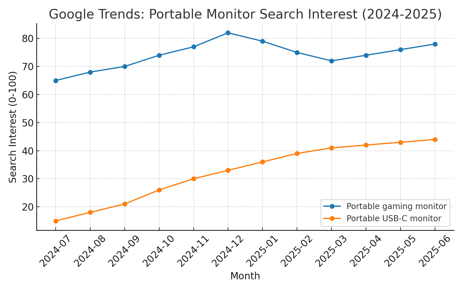• “Portable USB‑C monitor” climbed steadily from 15 in mid‑2024 to 44 by mid‑2025.