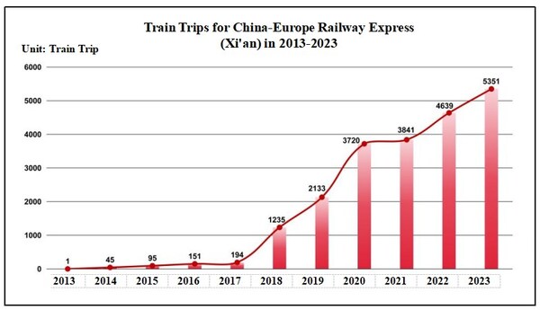 Photo shows the train trips for China-Europe Railway Express (Xi'an) in 2013-2023.