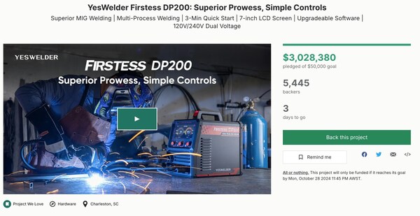 NEW YORK,Oct. 25,2024 -- With just days left,the buzz around YesWelder's revolutionary Firstess DP200 is growing,and now's your last chance to get in on this incredible opportunity. The record-breaking Kickstarter campaign,which has captured the welding community's attention,ends in just three days.