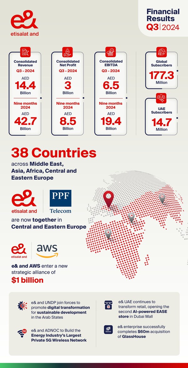 e& announces Q3 2024 earnings with consolidated revenue growth of 10% to AED 14.4 billion