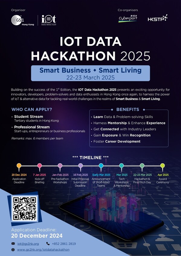 Organised byGS1 Hong Kong in collaboration with Cyberport and HKSTP,the IOT Data Hackathon 2025 will take place on 22-23 March 2025,with a series of pre-hackathon activities to be launched from January to March 2025. With the rapid advancement ofIOT technology,the command of data has become more crucial than ever. This Hackathon invites participants to harness the power ofIOT data and alternative data to create transformative solutions in two key Challenge Themes:
