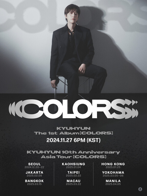 Kyuhyun will mark the grand beginning of the tour in Seoul,giving a 3-day concert at the Olympic Hall in Olympic Park on Dec. 20-22. After taking the stage in Seoul,he will continue his tour in 2025,performing in Kaohsiung (Jan. 4),Hong Kong (Jan. 25),Jakarta (Feb. 8),Taipei (Feb. 22),Yokohama (March 5-6),Bangkok (March 15),Macau (March 22) and Manila (Apr. 5).