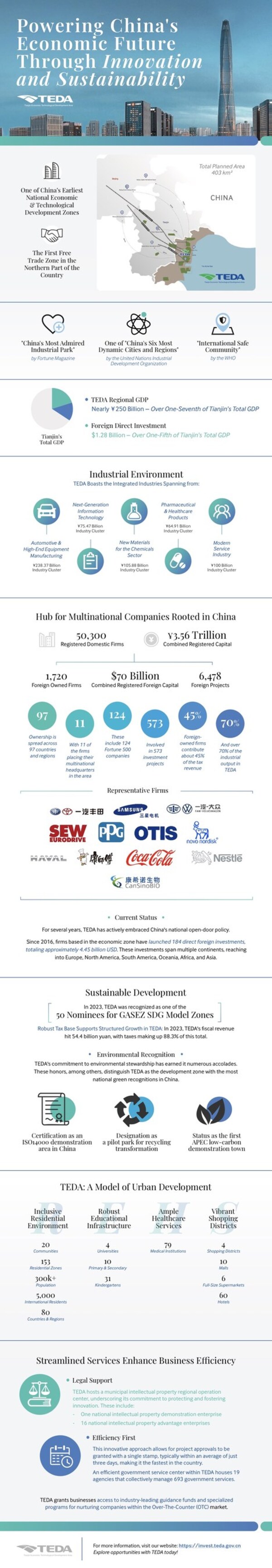Leveraging strategic thinking,industrial payout and synergistic services,TEDA has been the No.1 economic development zone in terms of overall impact in China for 16 consecutive years. By the end of 2023,TEDA had brought in 6,478 foreign investment projects from 97 countries and regions,including 573 projects from 124 Fortune 500 companies,with total foreign investment totaling USD69.557 billion.