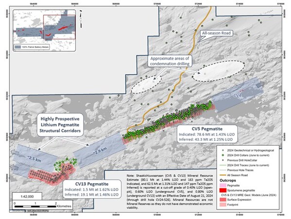 1Shaakichiuwaanaan (CV5 & CV13) Mineral Resource Estimate (80.1 Mt at 1.44% Li2O and 163 ppm Ta2O5 Indicated,and 62.5 Mt at 1.31% Li2O and 147 ppm Ta2O5 ppm Inferred) is reported at a cut-off grade of 0.40% Li2O (open-pit),0.60% Li2O (underground CV5),and 0.80% Li2O (underground CV13) with an Effective Date of August 21,2024 (through drill hole CV24-526). Mineral Resources are not Mineral Reserves as they do not have demonstrated economic viability.