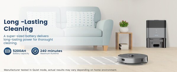 Equipped with a combined dustbin and water tank,the T25 Plus seamlessly transitions between vacuuming and mopping,offering a comprehensive cleaning solution in one compact unit. With a remarkable 240-minute maximum runtime,it can handle large homes without needing a recharge,ensuring uninterrupted performance. The self-emptying base further enhances convenience,storing debris for up to 60 days before requiring manual intervention.