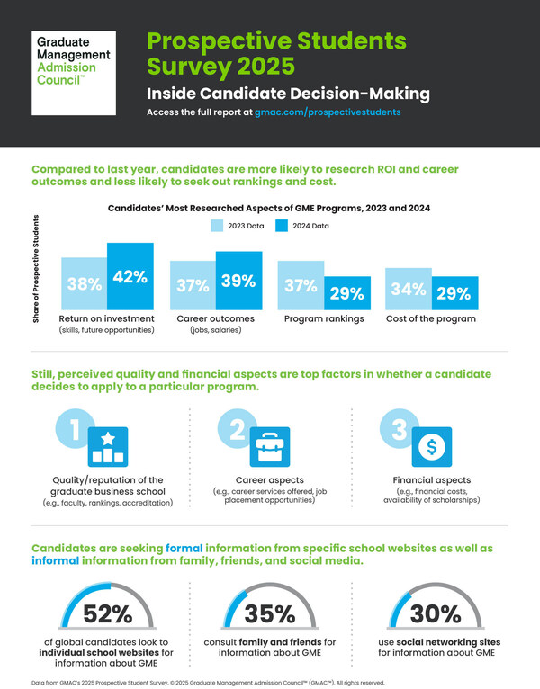 With 15 years of survey responses representing all world regions,the GMAC Prospective Students Survey has provided the world's graduate business schools with critical insights into the decision-making processes of people currently considering applying to a graduate management education program. This year's summary report analyzes 2024 data from 4,912 respondents across 147 countries—45 percent female and 67 percent Gen Z—offering insights into evolving candidate decision-making to guide business school strategies. The full report with additional findings is available on gmac.com.