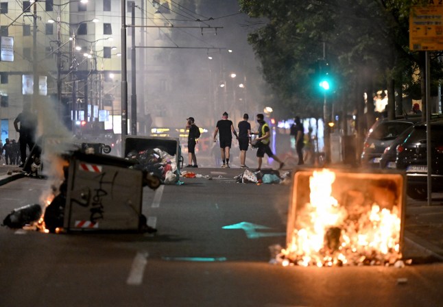 Serbian anti-government protesters burn a trash container during a riot in Belgrade on August 15,2025 (Picture: AFP)