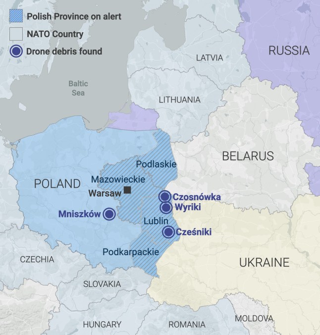This comes as Nato members Poland and Romania both scrambled fighter jets to respond to drones violating their skies on Saturday.